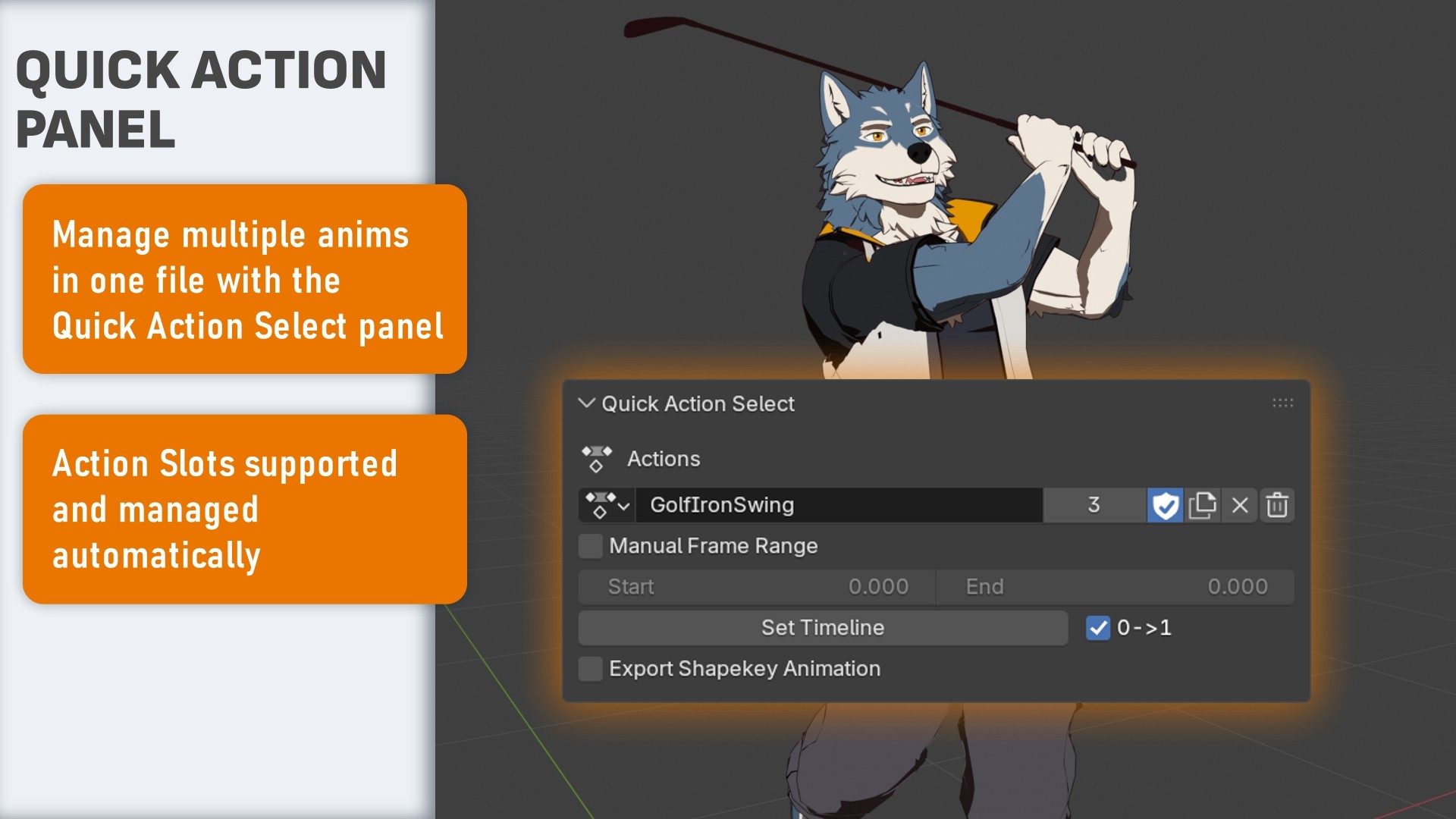 - Quick Action panel for managing Blender Actions without diving into obscure menus.