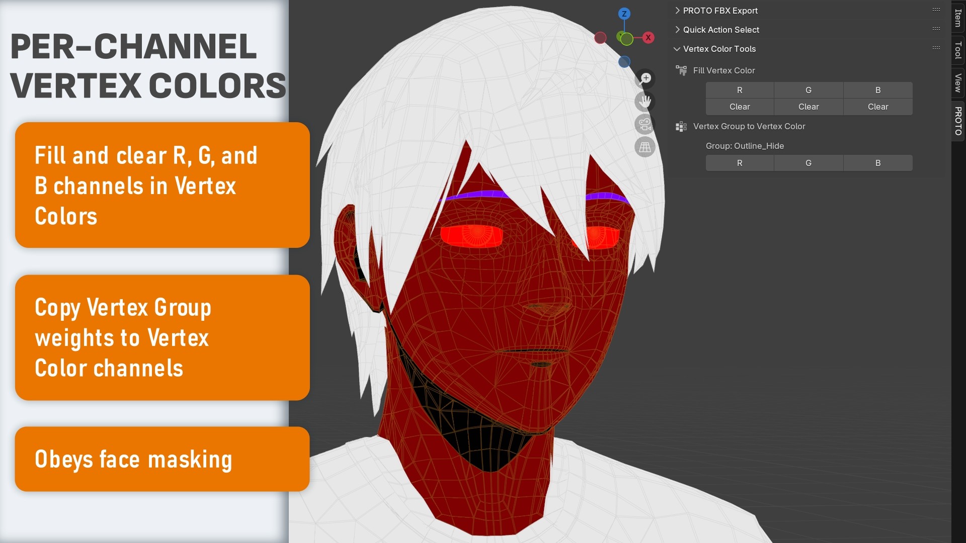 - Per-channel vertex painting tools, including converting Vertex Groups into colors.