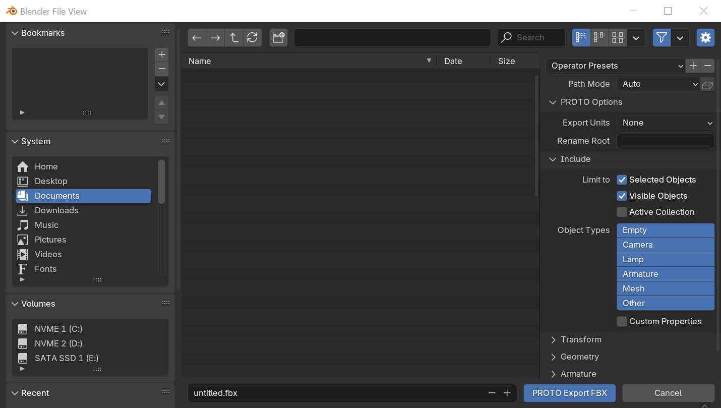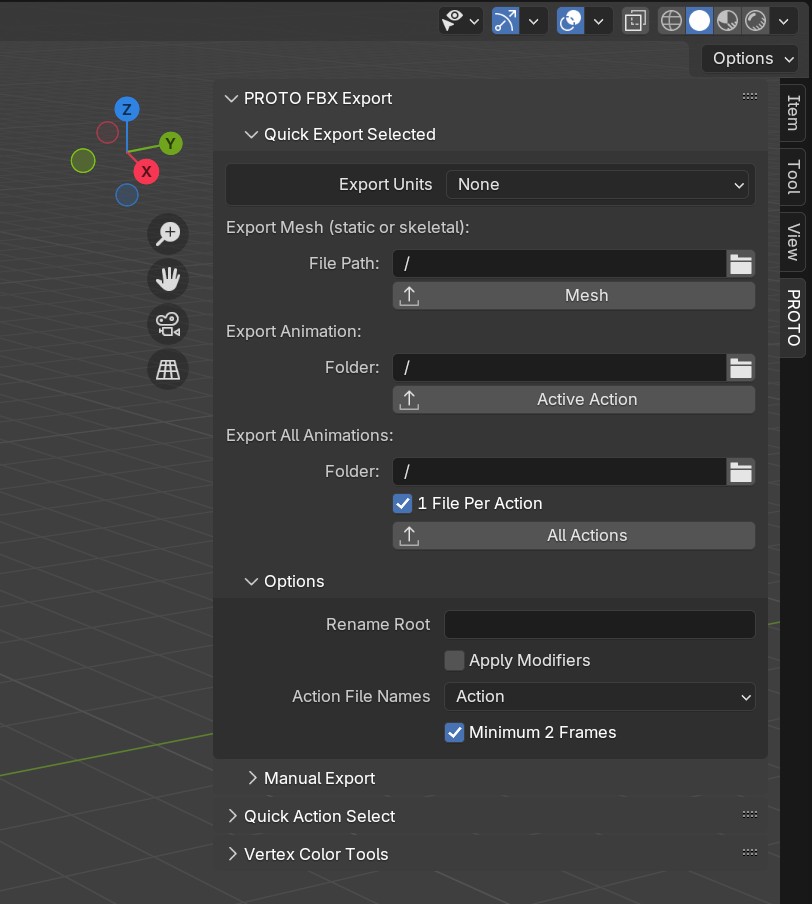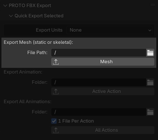 You can also open this export dialogue by navigating to File > Export > PROTO FBX (.fbx)