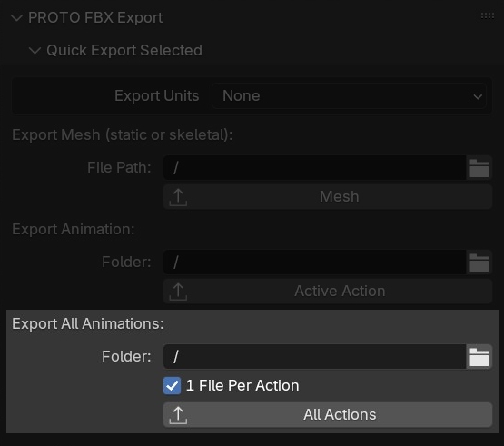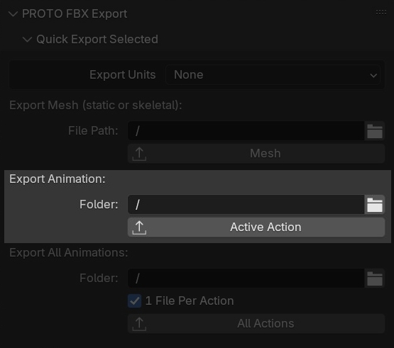 The Quick Export panel is built around keeping meshes and animations in separate files.