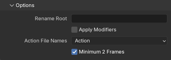 When exporting Actions as FBX animations, the format to use for their file names. Can optionally enter a shared name that will be combined with Action names.