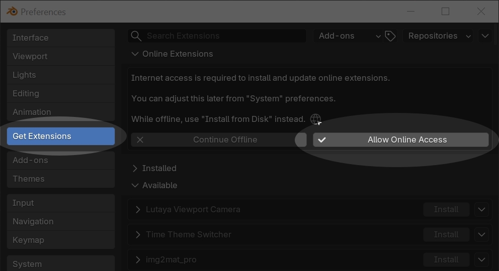 Open the Get Extensions tab. Then, if Online Access is not enabled yet, click the button to turn it on.