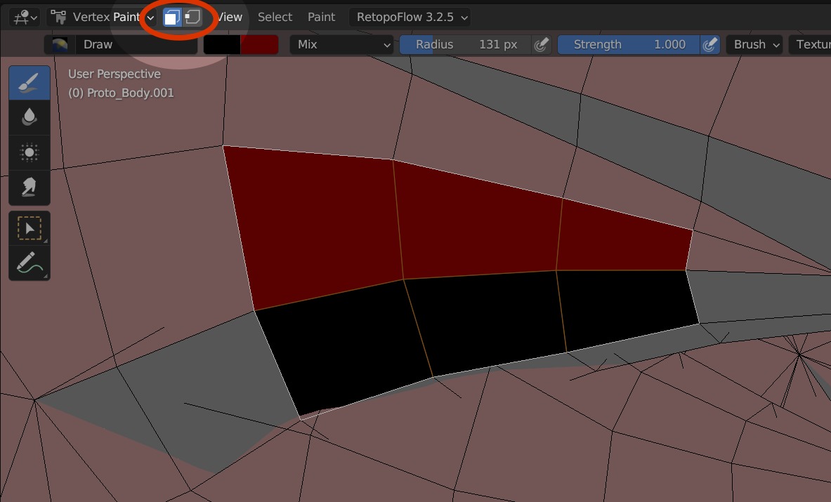 The mask uses our currently selected faces in Edit Mode. We can press Tab to toggle Edit Mode quickly, so we can make selections and return to Vertex Paint Mode.