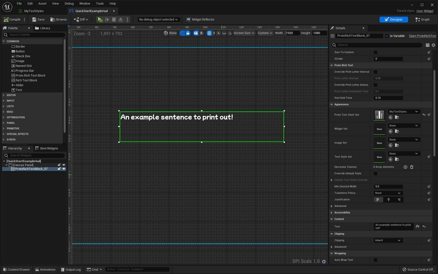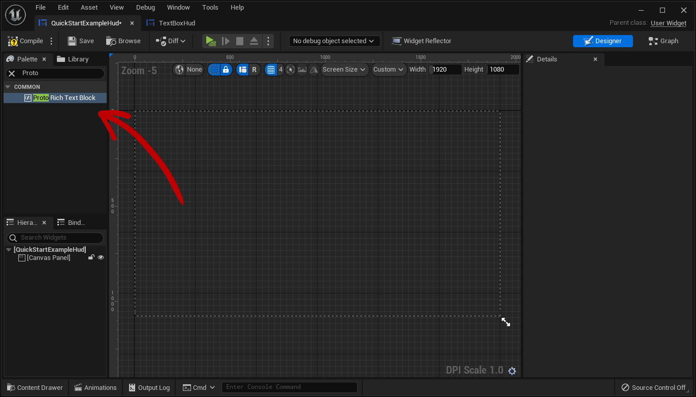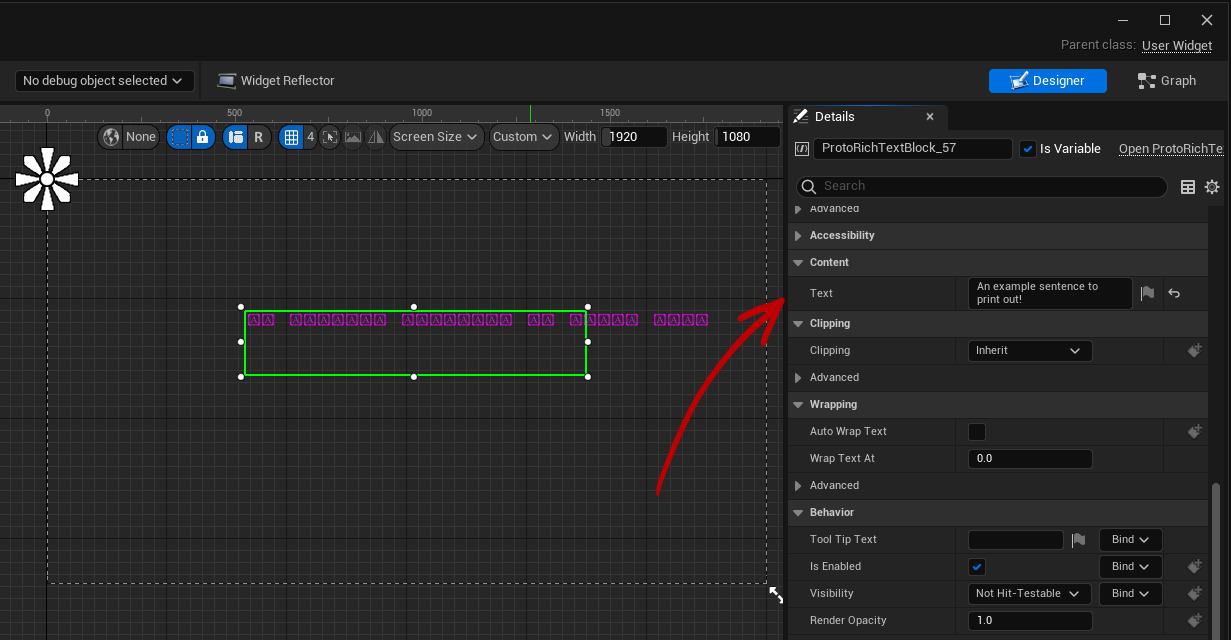 Next, return to your UserWidget asset and select the ProtoRichTextBlock.