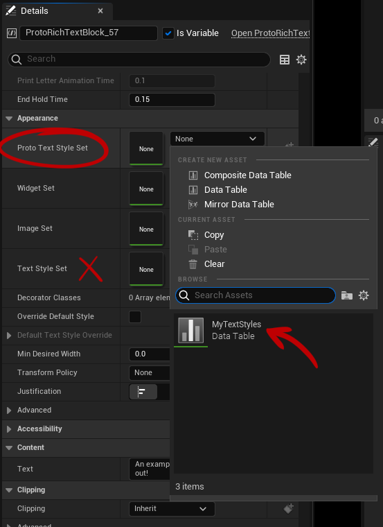 - Find the Proto Text Style Set property, and set it to the DataTable you just created.