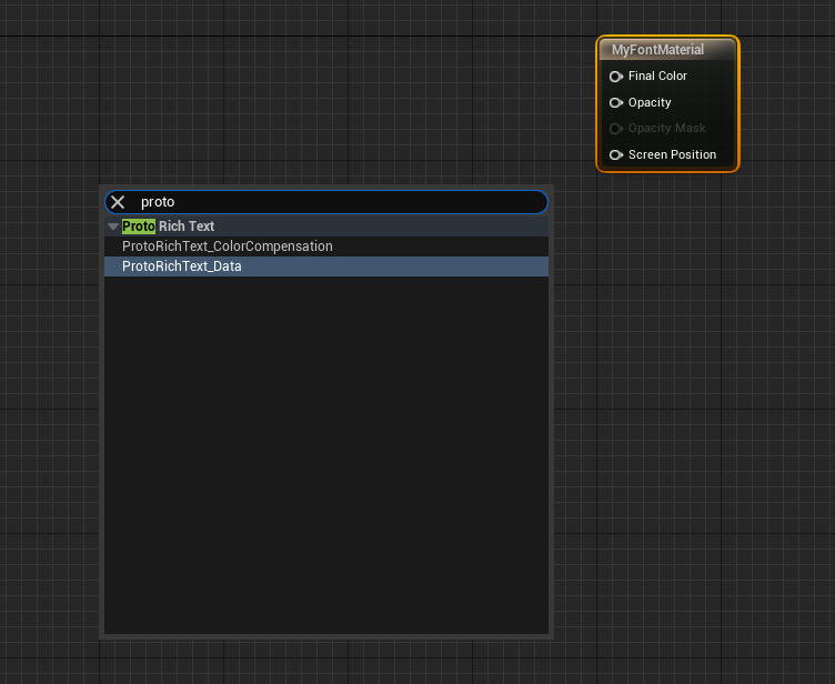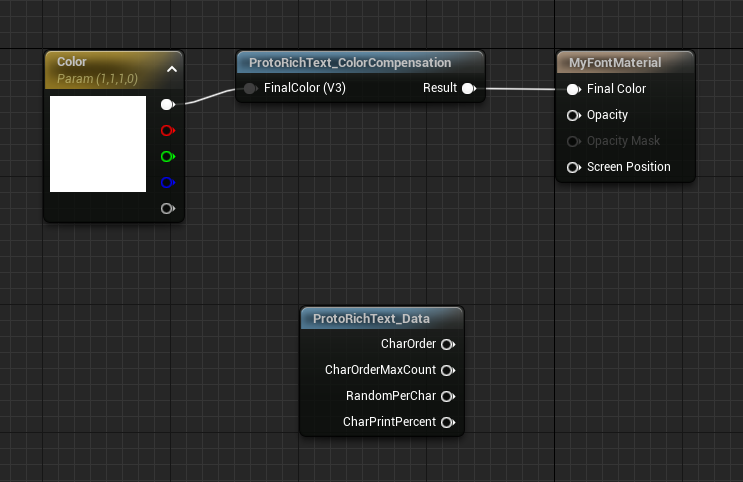 The first node we’ll use is ProtoRichText_ColorCompensation. This will fix up the colors of our text and display a color of our choice. Hook it up with a Vector Parameter like so: