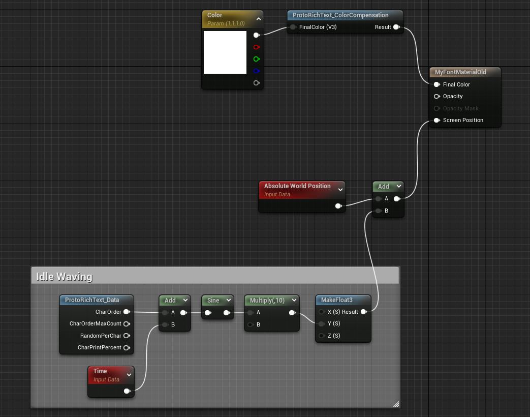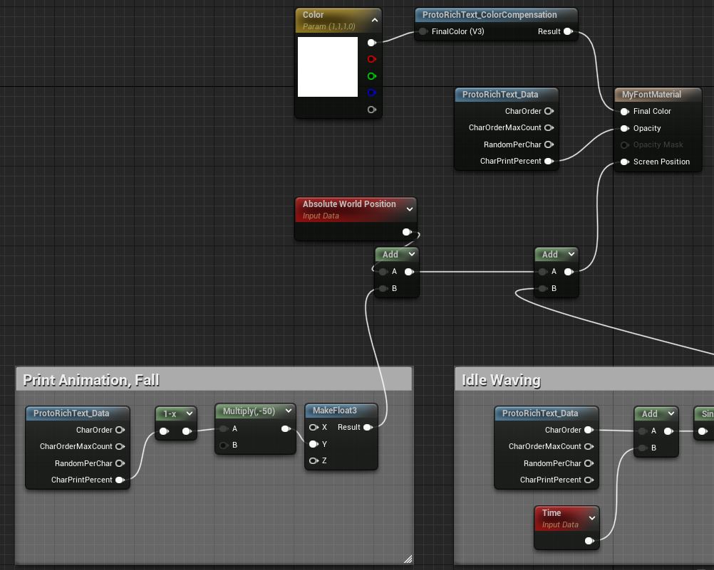 - The CharOrder pin on ProtoRichText_Data gives us an increasing number in-order per character. When added to Time, it offsets the Sine pattern per-character.
