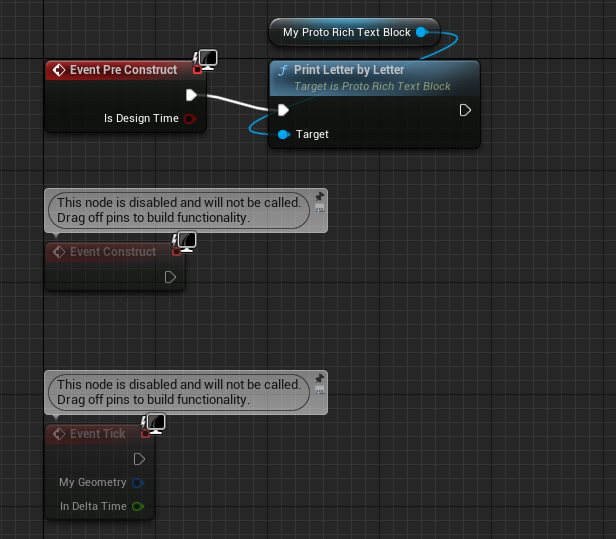 Drag the ProtoRichTextBlock variable into the Event Graph, and call the function PrintLetterByLetter on it.