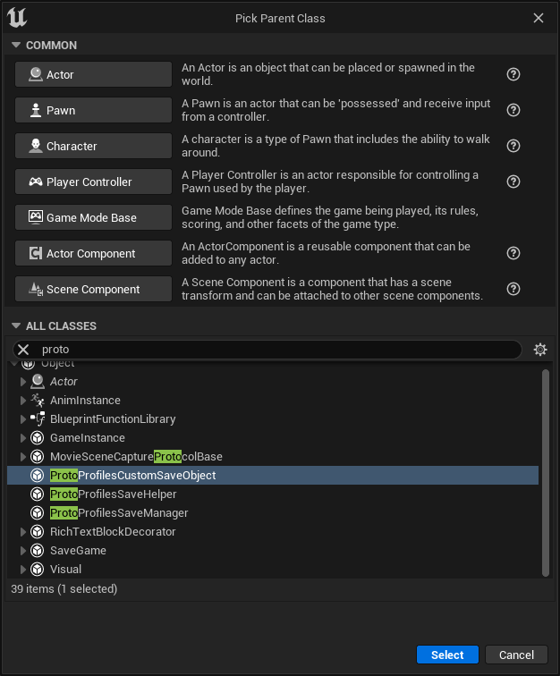 To create a Class to use as a CustomSaveObject, create a subclass of UProtoProfilesCustomSaveObject. You can do this in Blueprint or C++.