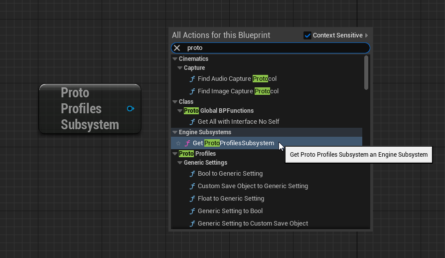 In C++, include “ProtoProfilesSubsyste.h” and call the macro GETPROTOPROFILESSUBSYSTEM(). (Or get it like any other Engine Subsystem).