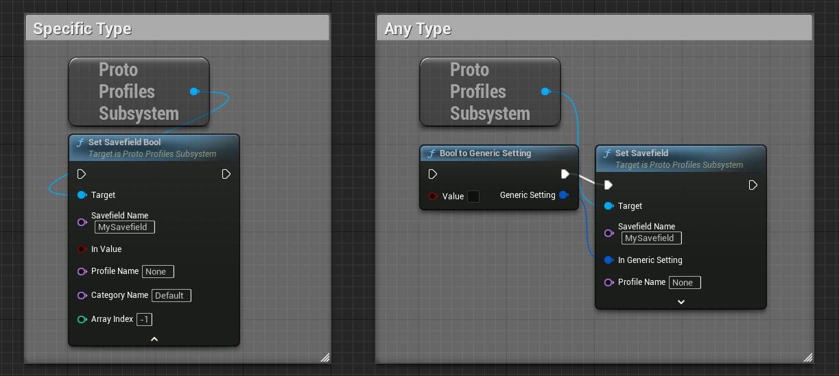 • In C++, FProtoSavefieldSetting has a constructor for each type, so simply pass in a value to the constructor to initialize it for your specific type.