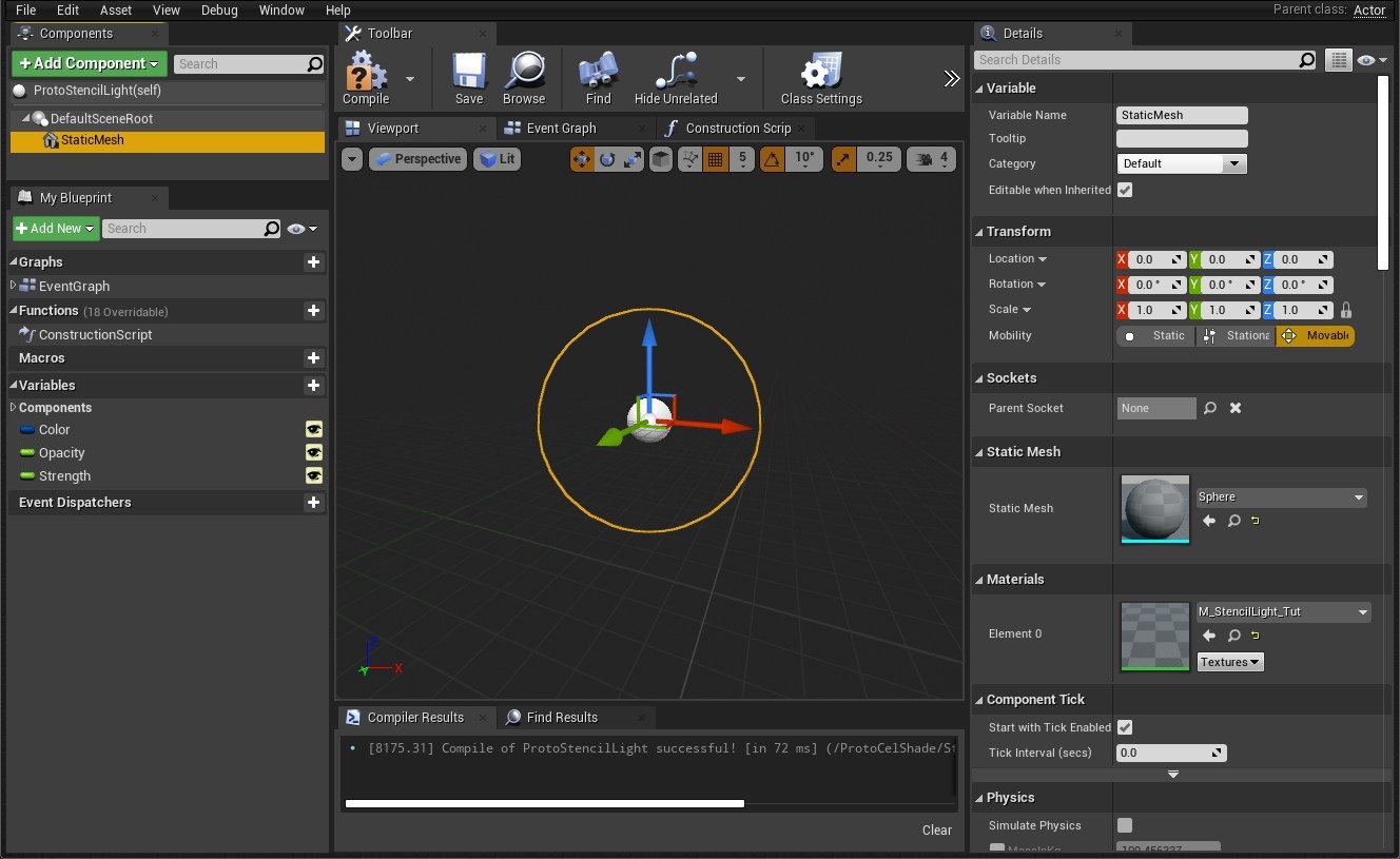 With that implemented, you now have a fully-functioning spherical stencil light. You can tweak the color, strength, and opacity in the object’s Details Panel.