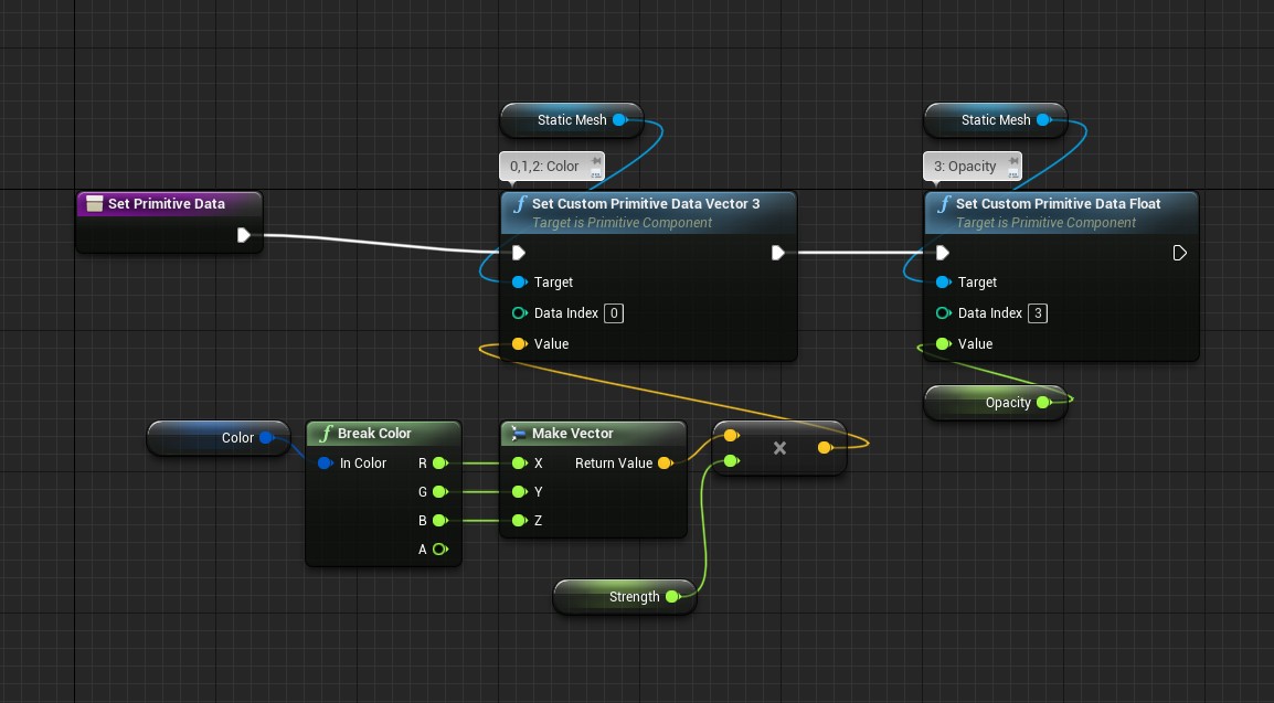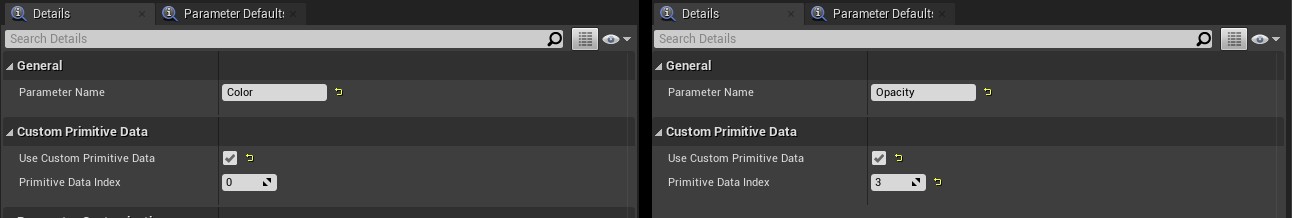 Create parameters for Color and Opacity, and check the box for Use Custom Primitive Data. These will correspond to the data we sent in the blueprint.