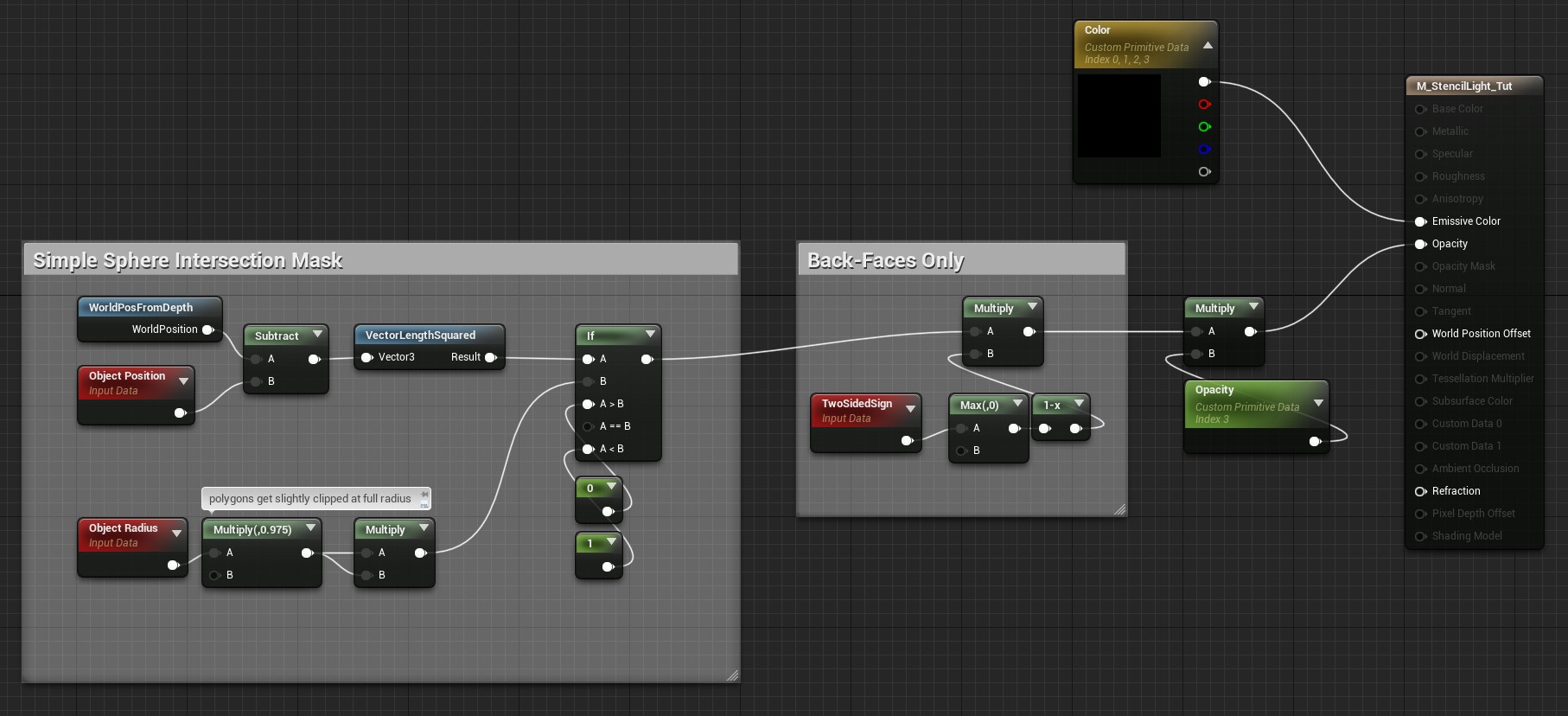The problem is when we have multiple lights, we need to be able to process pixels for each stencil light independent to other ones. If there is more than 1 light, there are cases where their spheres will overlap (in the world, or on the screen), and a post process material reading custom depth will not give us enough information in these cases. Whichever sphere is closer to the camera stomps info about the other.