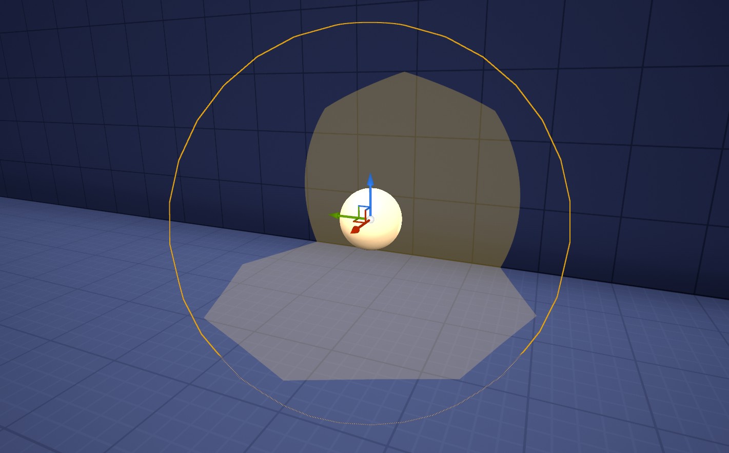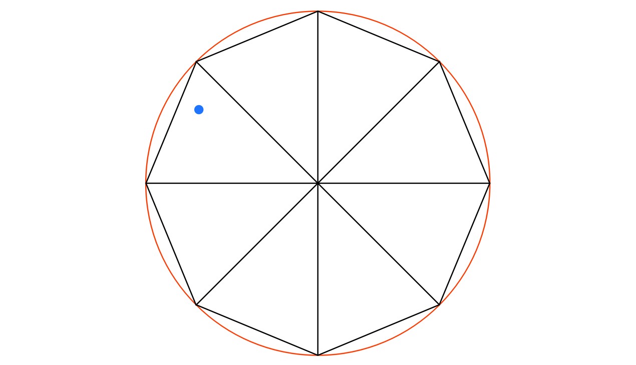 The red circle is the sphere, the blue dot is the test position. The black lines are the imaginery triangles that make up our 8-sided poly circle.