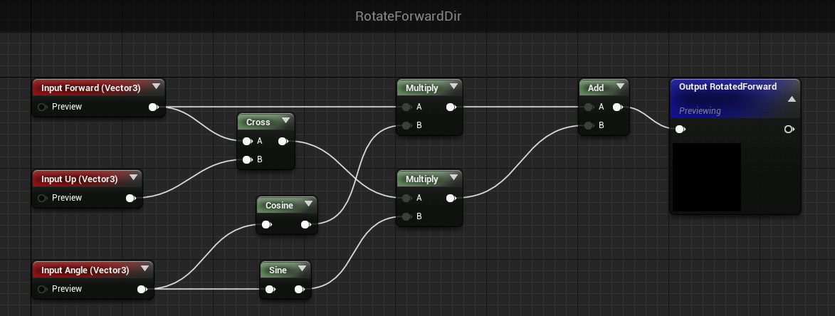 This is the function we’ll call from our material. It does the 3 animations outlined above, and uses the RotateForwardDir function.