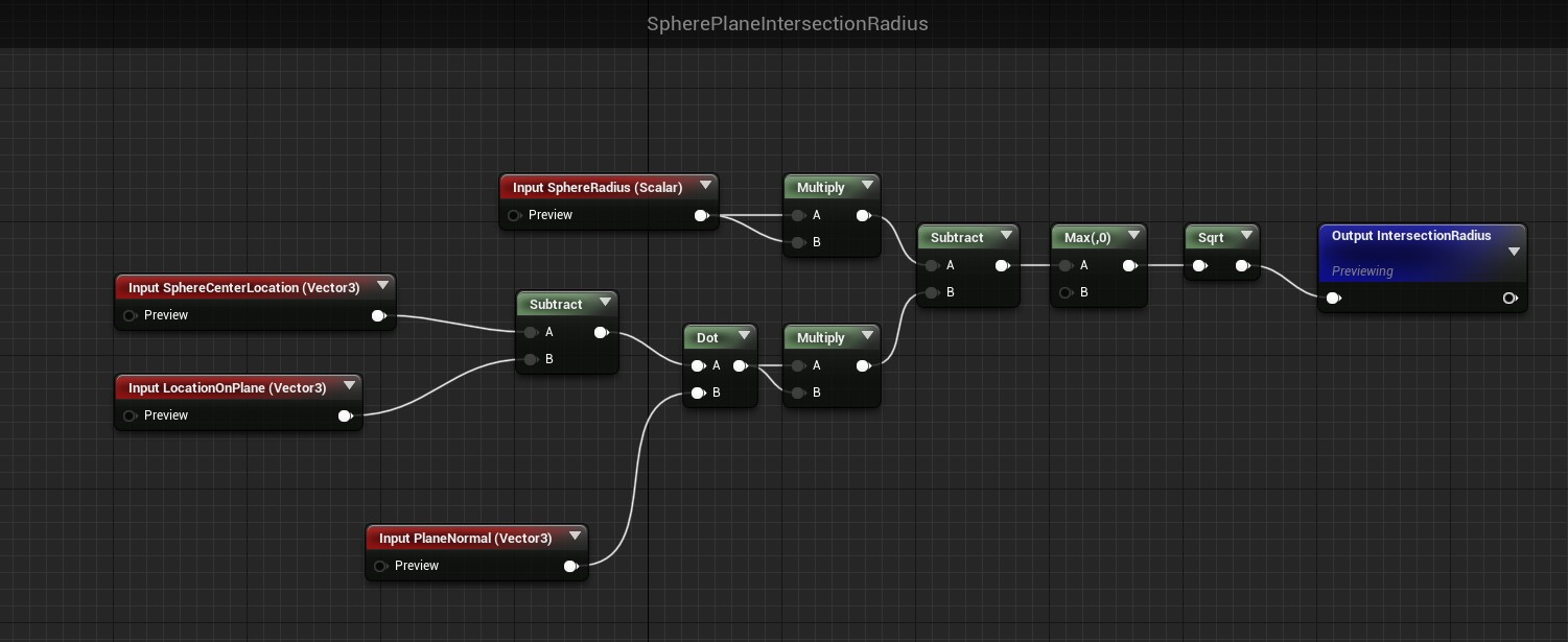 For a given world position, we will imagine a plane at that position orthogonal to the sphere’s up axis. We will solve a sphere-plane intersection and get the radius of the resulting circle.