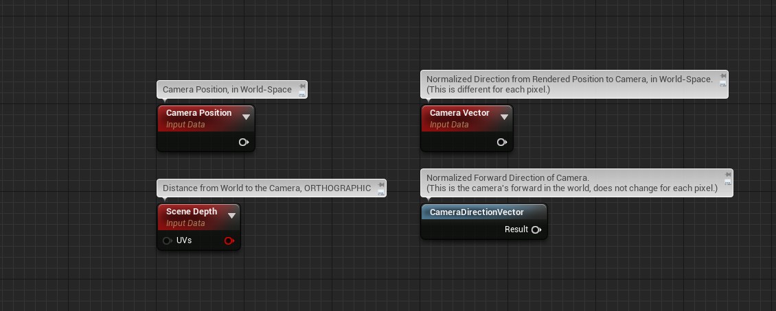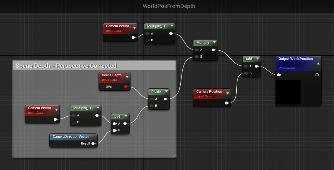 To do so, we have to use the CameraDirectionVector. I’m going to spare you the trigonometric gymnastics of vector projection here. It works out that you can transform the Scene Depth value into the corrected value with a dot product and a division.