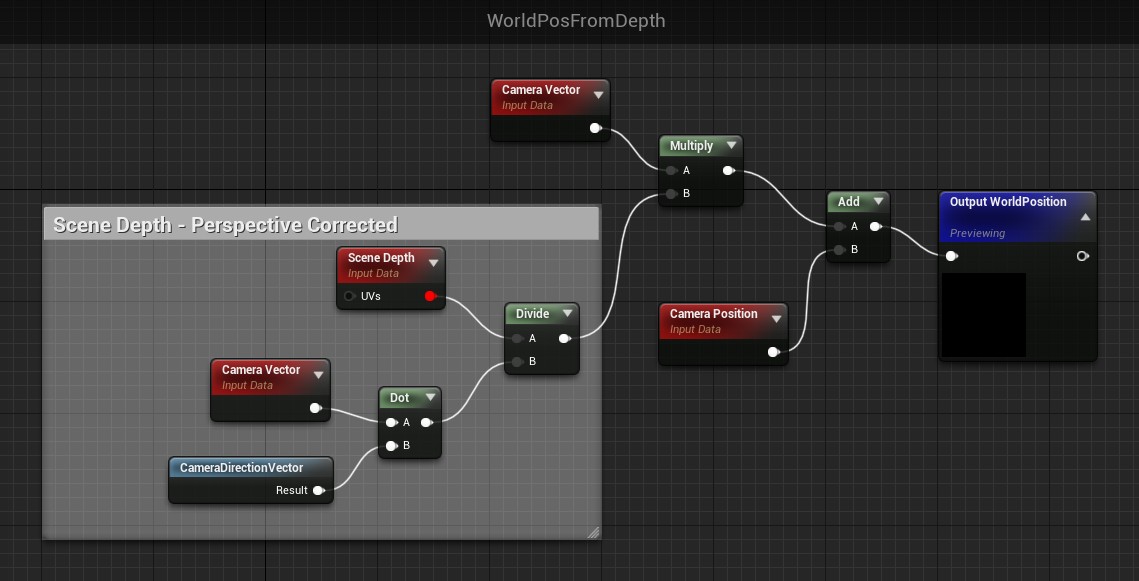 WorldPosFromDepth will do the heavy lifting of the material. It is going to use the Depth Buffer to find the world position of the environment for the pixel being rendered.